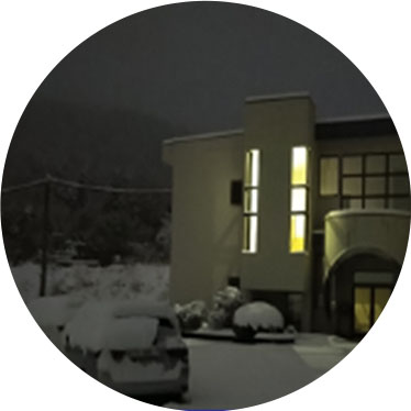 ※本社所在地、岐阜県美濃市の冬は時に豪雪で埋もれてしまいます。足跡ない雪景色。多くの研究員が協力して1日24時間の効率化を進めております。